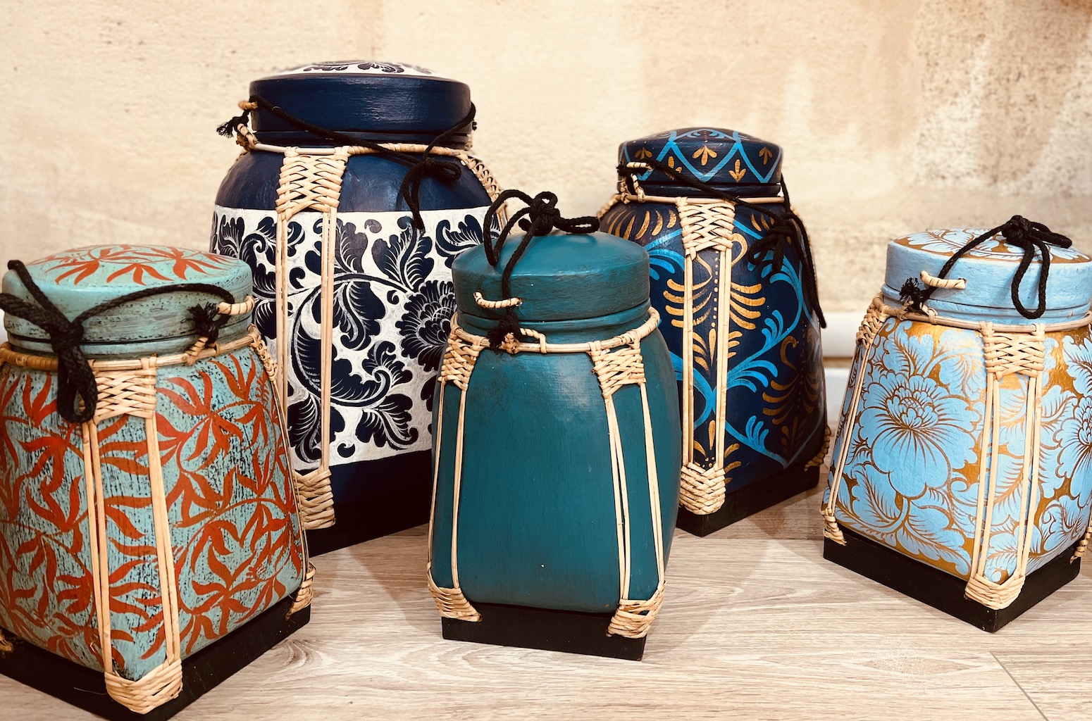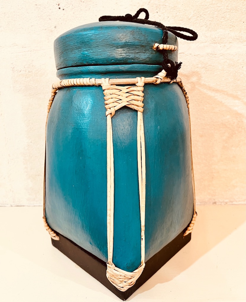 Magnifiques Boîtes à riz asiatique traditionnelles fabriquées entièrement à la main en bambou tissé, recouvertes d’argile puis magnifiquement peintes à la main par des artisanes thaïlandaises.