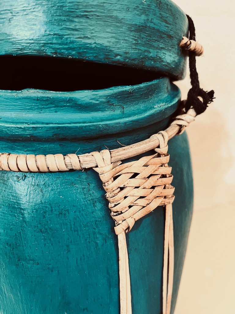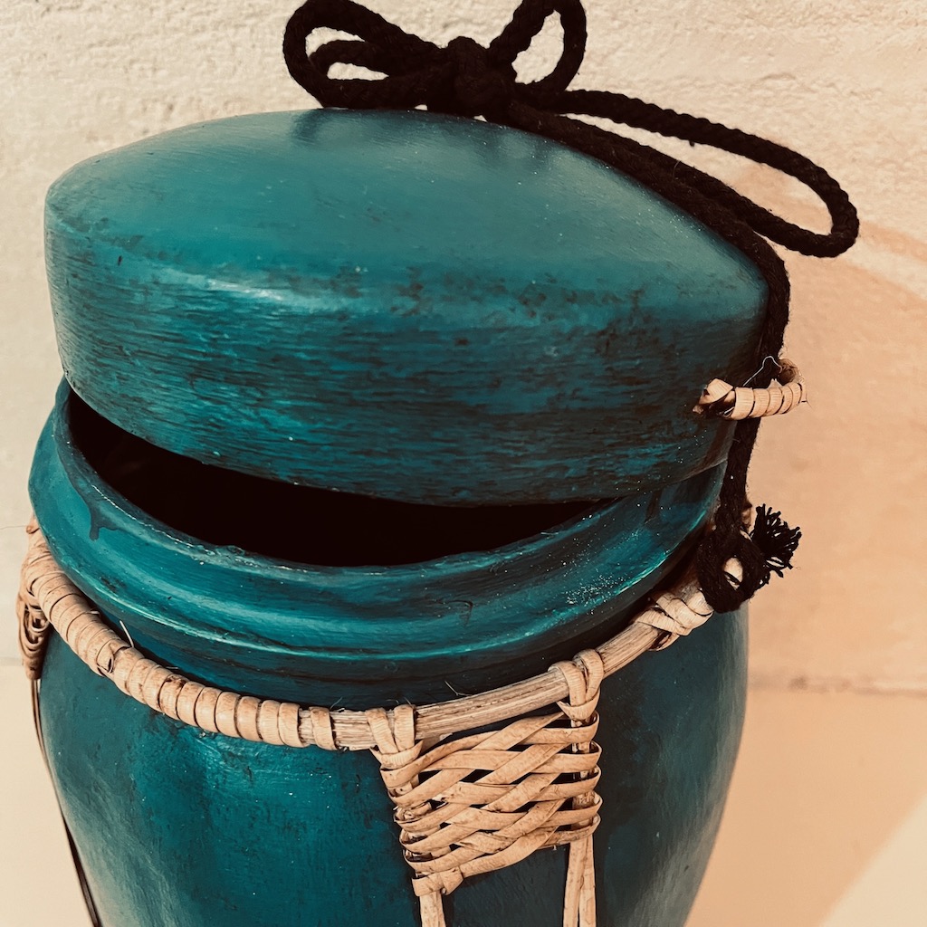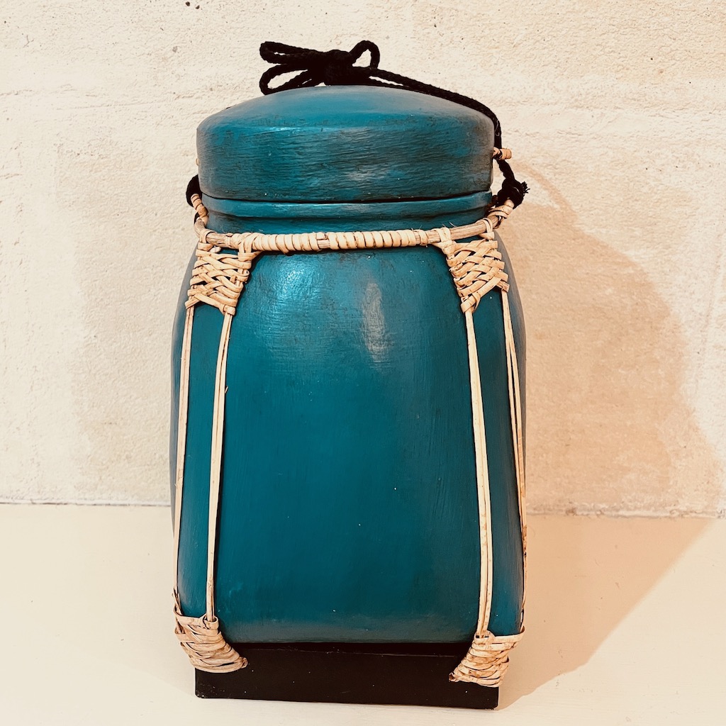 Ces Boîtes à riz asiatique traditionnelles fabriquées entièrement à la main en bambou tissé, recouvertes d’argile puis magnifiquement peintes à la main par des artisanes thaïlandaises.