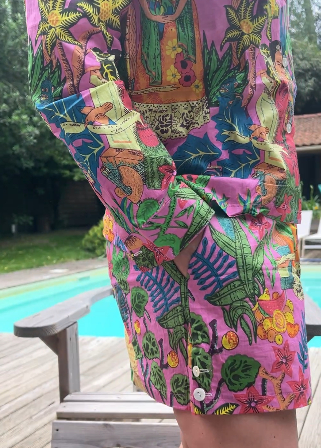 La chemise est confectionnée dans un coton doux, léger et respirant, parfait pour les journées ensoleillées. Son imprimé floral est réalisé selon la technique traditionnelle du block print, une méthode artisanale indienne qui consiste à tamponner les motifs à la main à l’aide de blocs de bois sculptés.