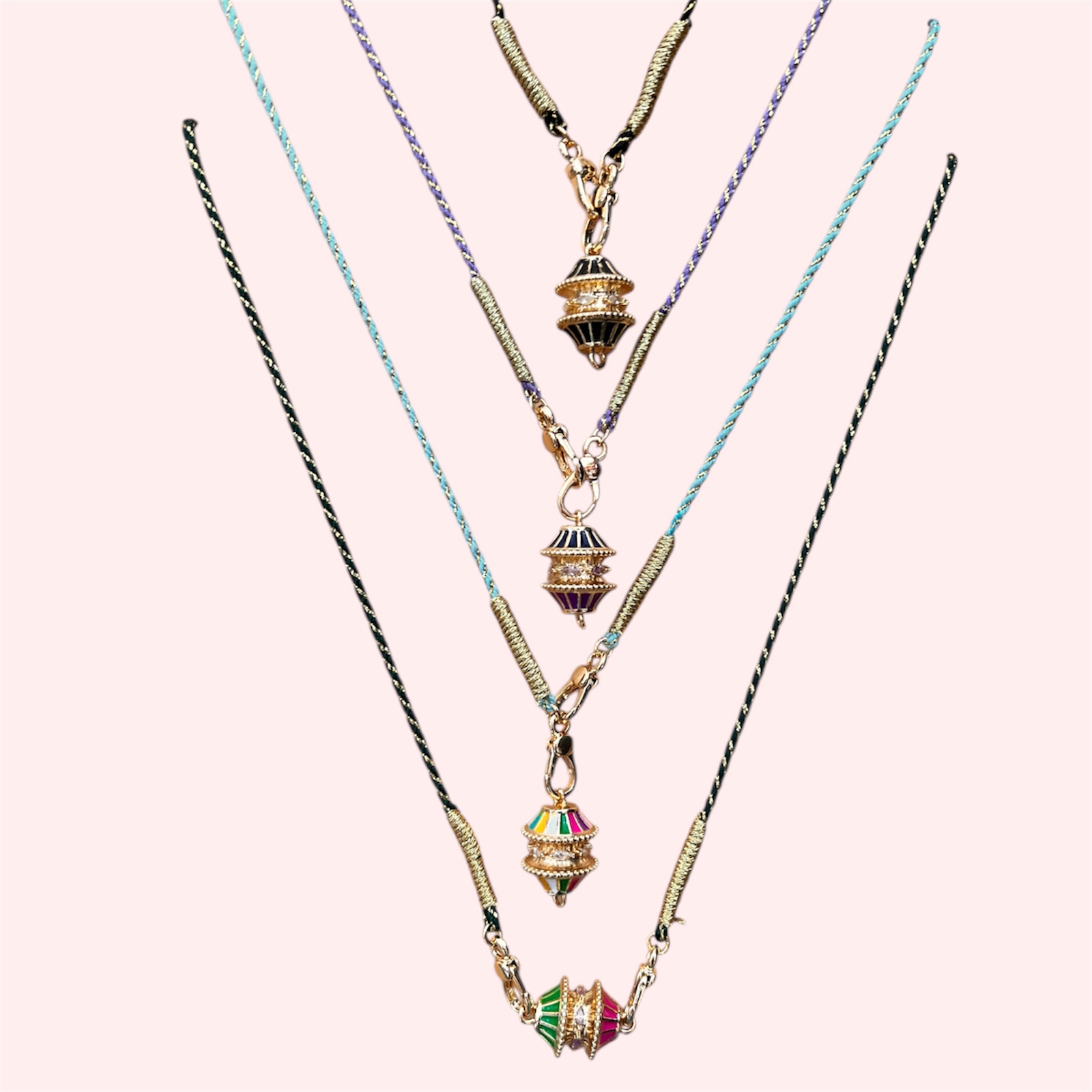 Issu de l’artisanat indien, ce collier talisman est un bijou protecteur, à la fois spirituel et élégant. Composé d’un pendentif en émail coloré et plaqué or, il est monté sur un cordon tressé en coton turquoise et doré, soigneusement noué à la main. Il est orné de petites pierres, choisies pour leurs vibrations douces et lumineuses.