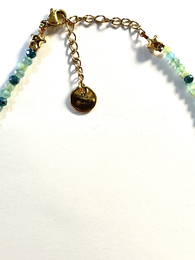 Le Collier Ras de Cou Celadon en perles de verre à facettes mix de vert d’eau, éclatantes avec leurs multiples facettes et mélangées de façon aléatoires avec des mini perles rondes dorées plaquées or.