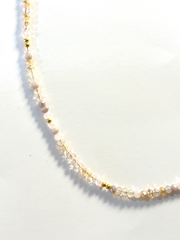 Le Collier Ras de Cou Nude en perles de verre à facettes, éclatantes avec leurs multiples facettes et mélangées de façon aléatoires avec des perles dorées en plaqué or.