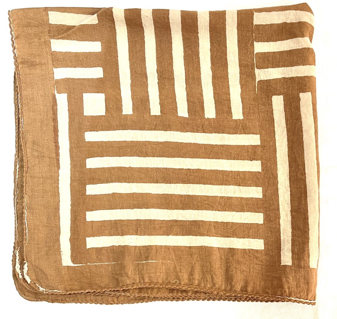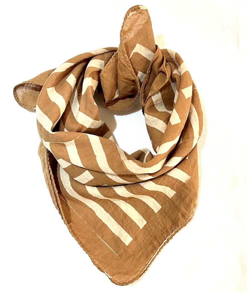 Ce Foulard Rayures Terra, tel un bandana carré, coloré et imprimé à la main sur un tissu en voile de coton, doux et léger, il enveloppera votre cou pour un look ultra-tendance!