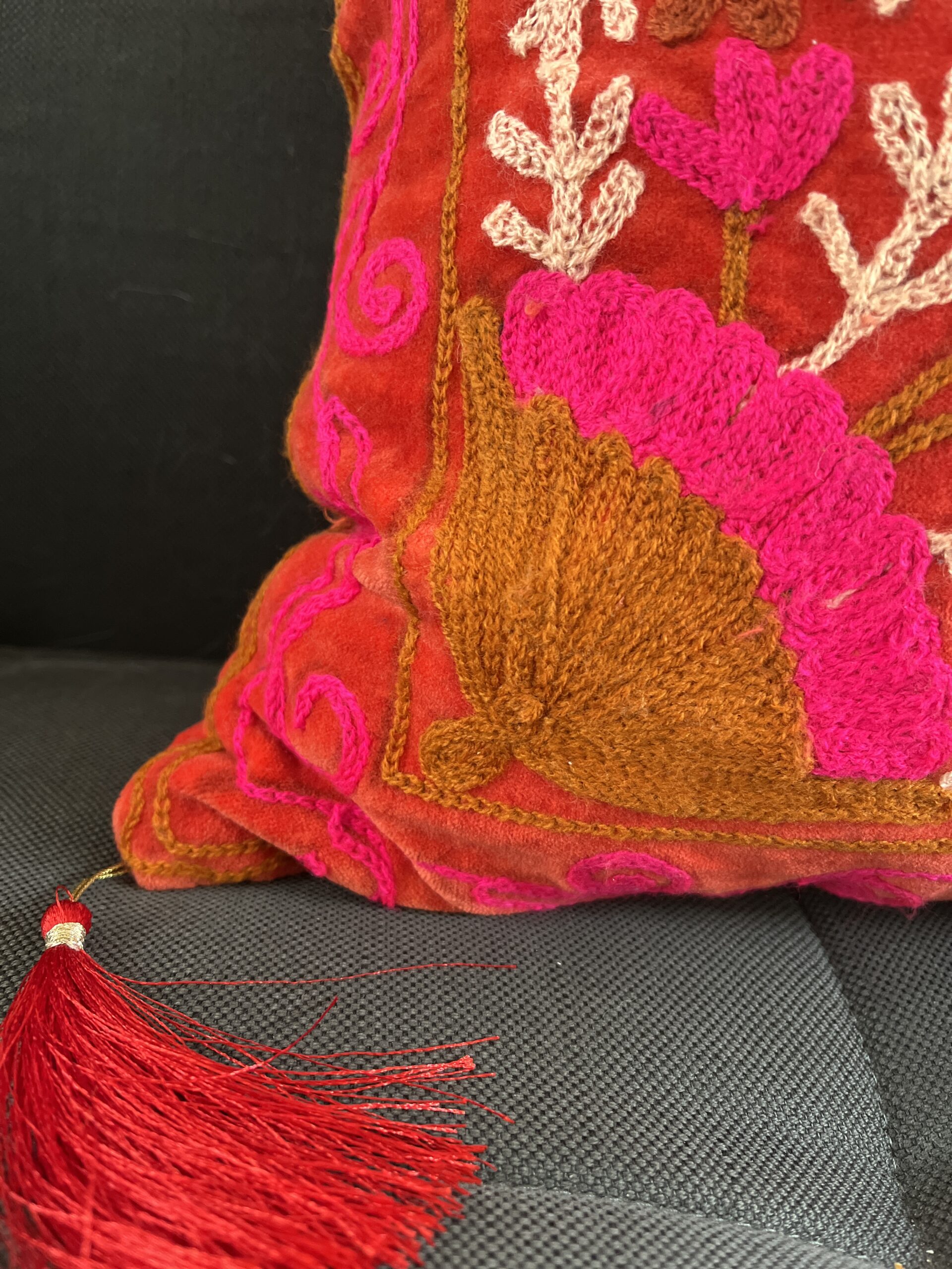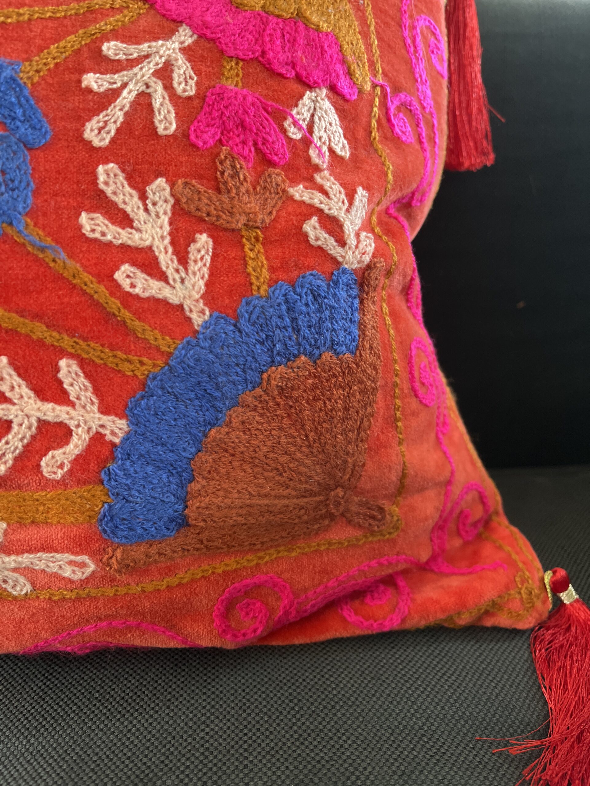 Housse de coussin 40×60 en velours brodé. Fabrication artisanale en Inde, broderie en laine. Déhoussable. Pièce unique et colorée pour sublimer ton intérieur.