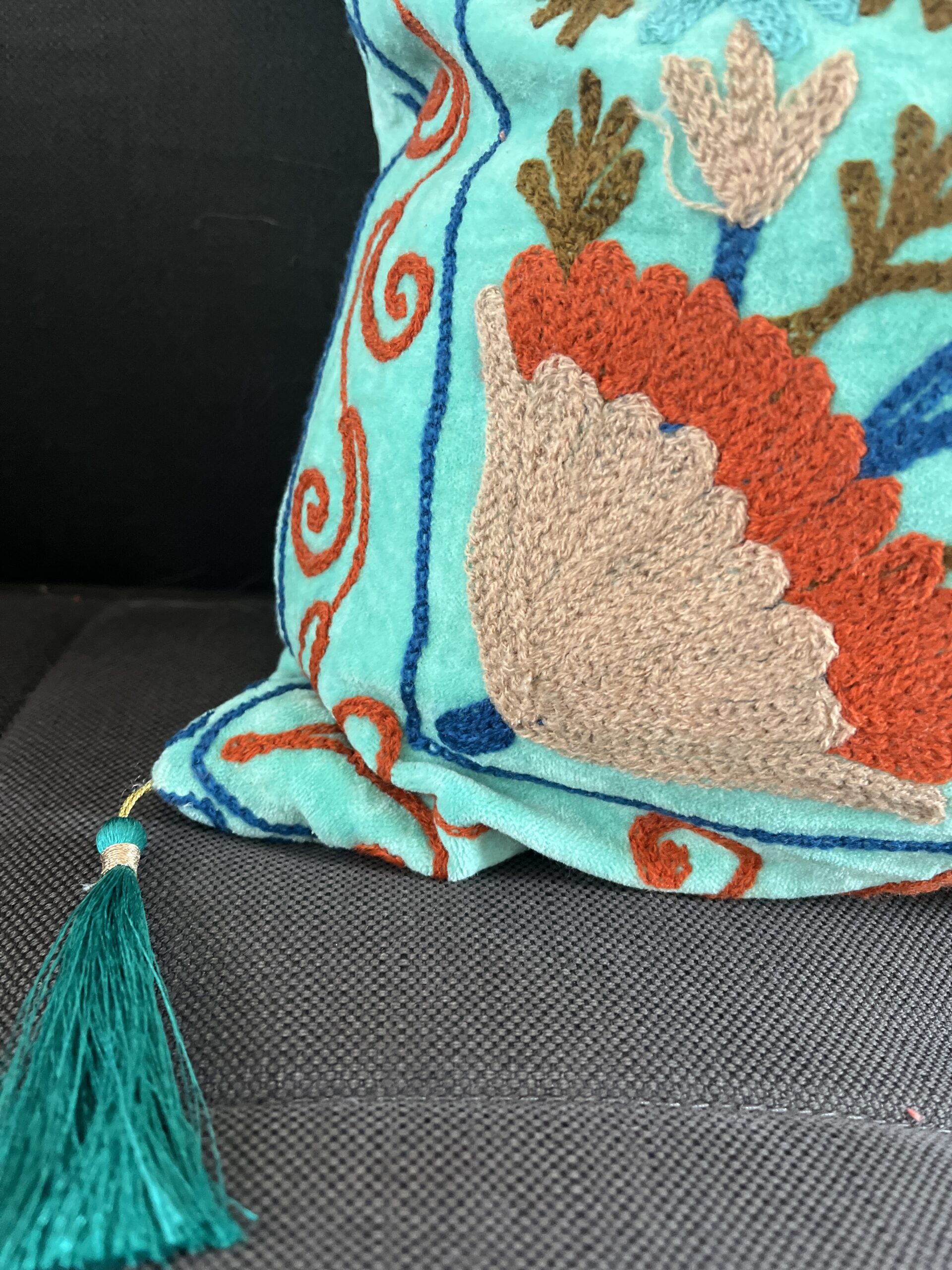 Housse de coussin 40×60 en velours brodé. Fabrication artisanale en Inde, broderie en laine. Déhoussable. Pièce unique et colorée pour sublimer ton intérieur.