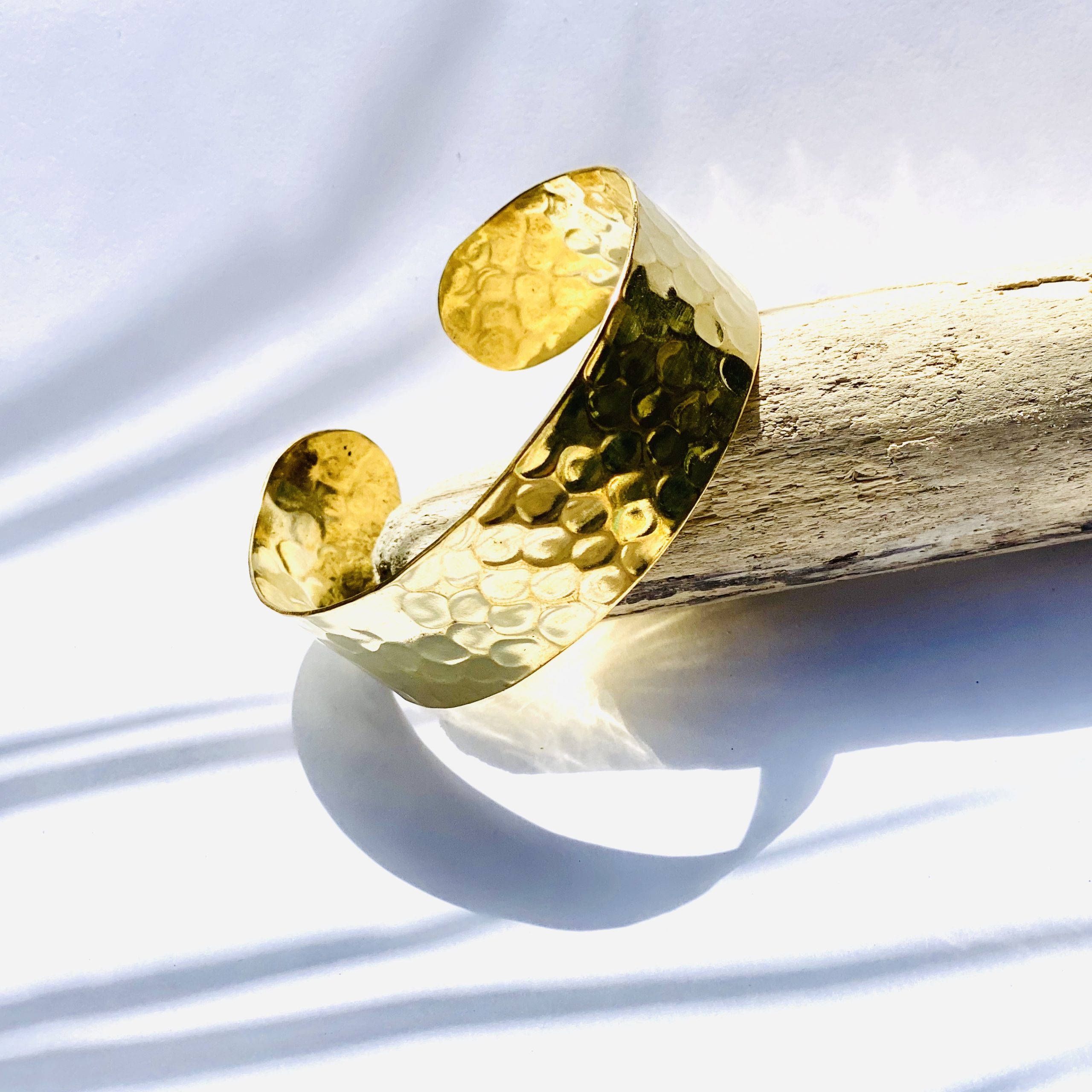 Bracelet manchette en laiton, martelé sur toute sa surface avec une finition brillante.
