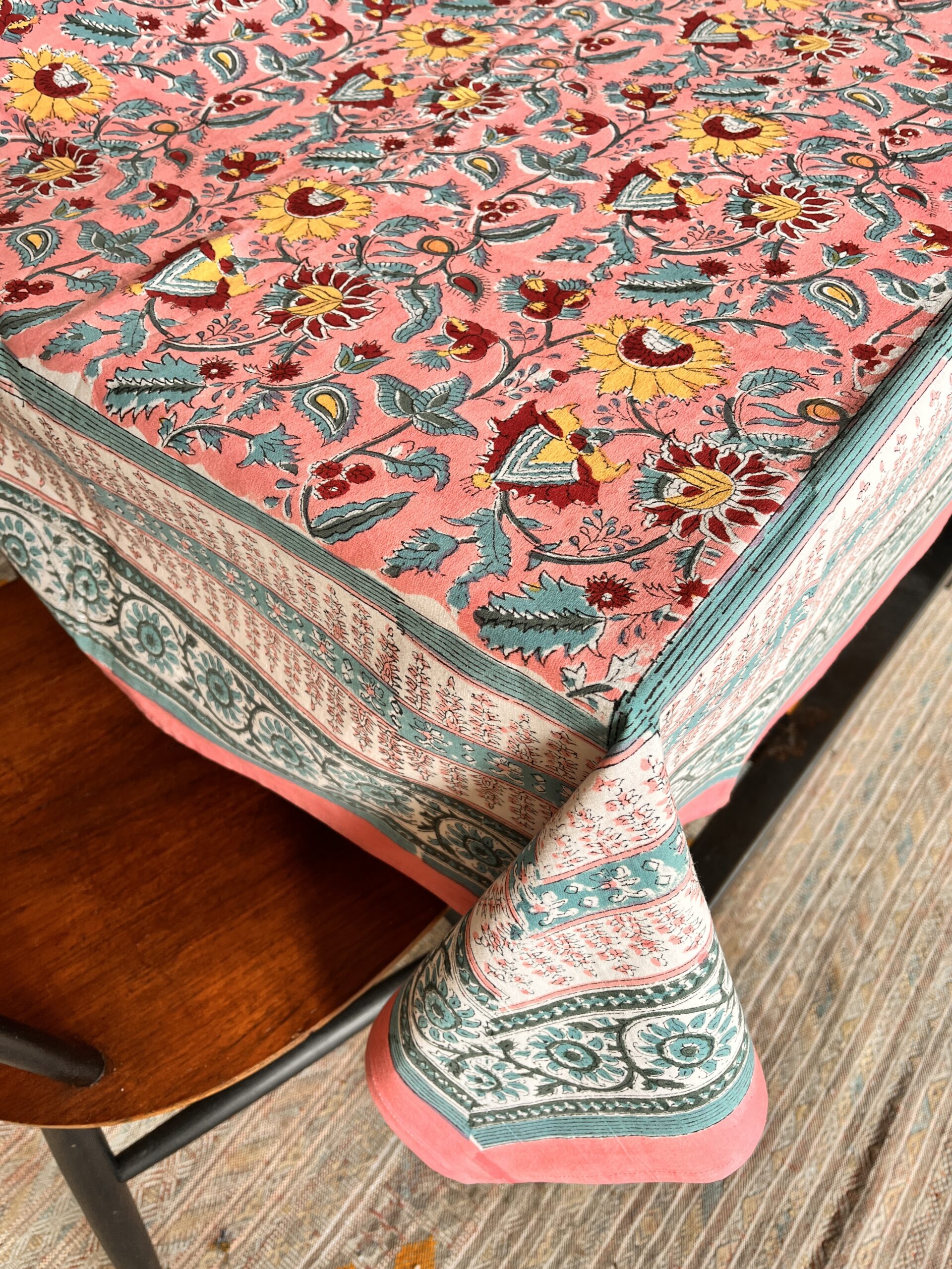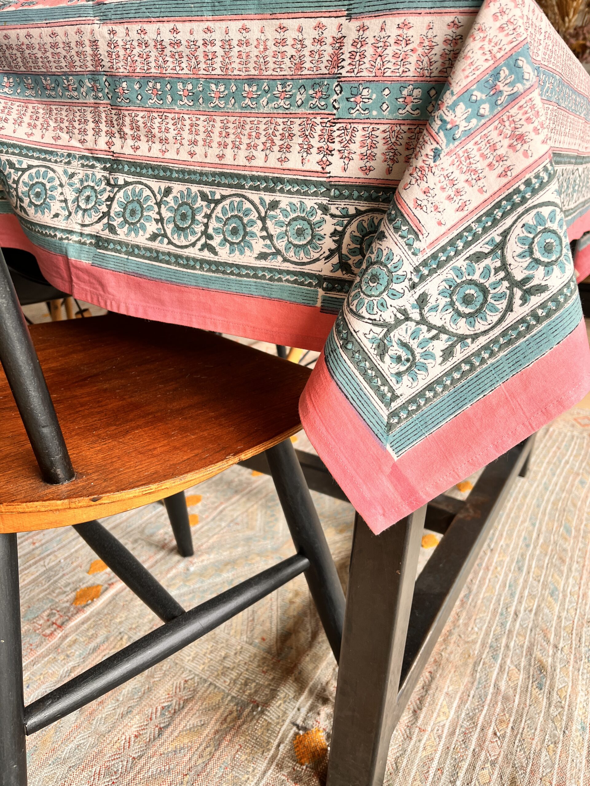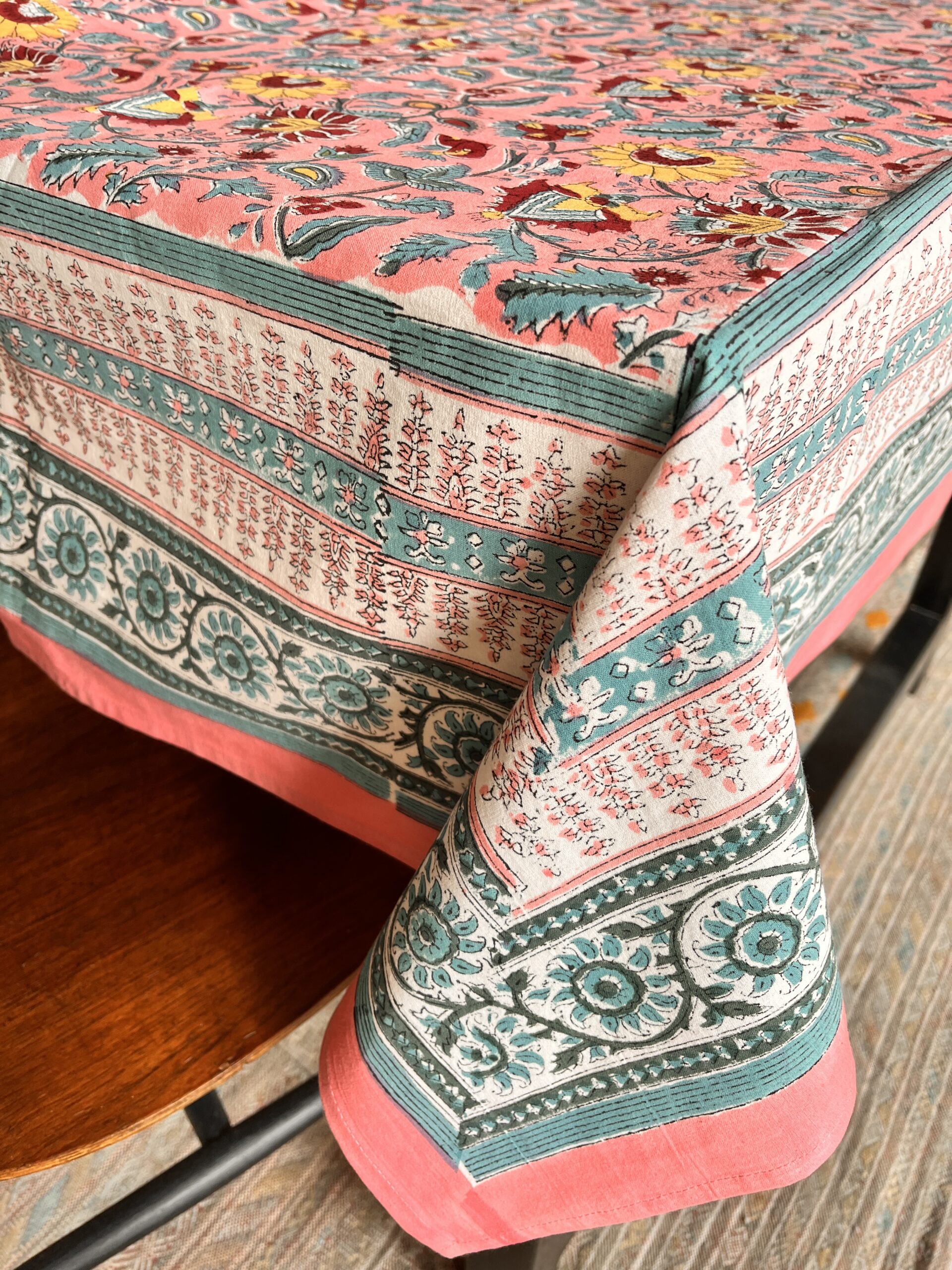 1.Impression artisanale : Chaque motif est appliqué à la main à l’aide de blocs de bois sculptés, ce qui rend chaque nappe légèrement différente.