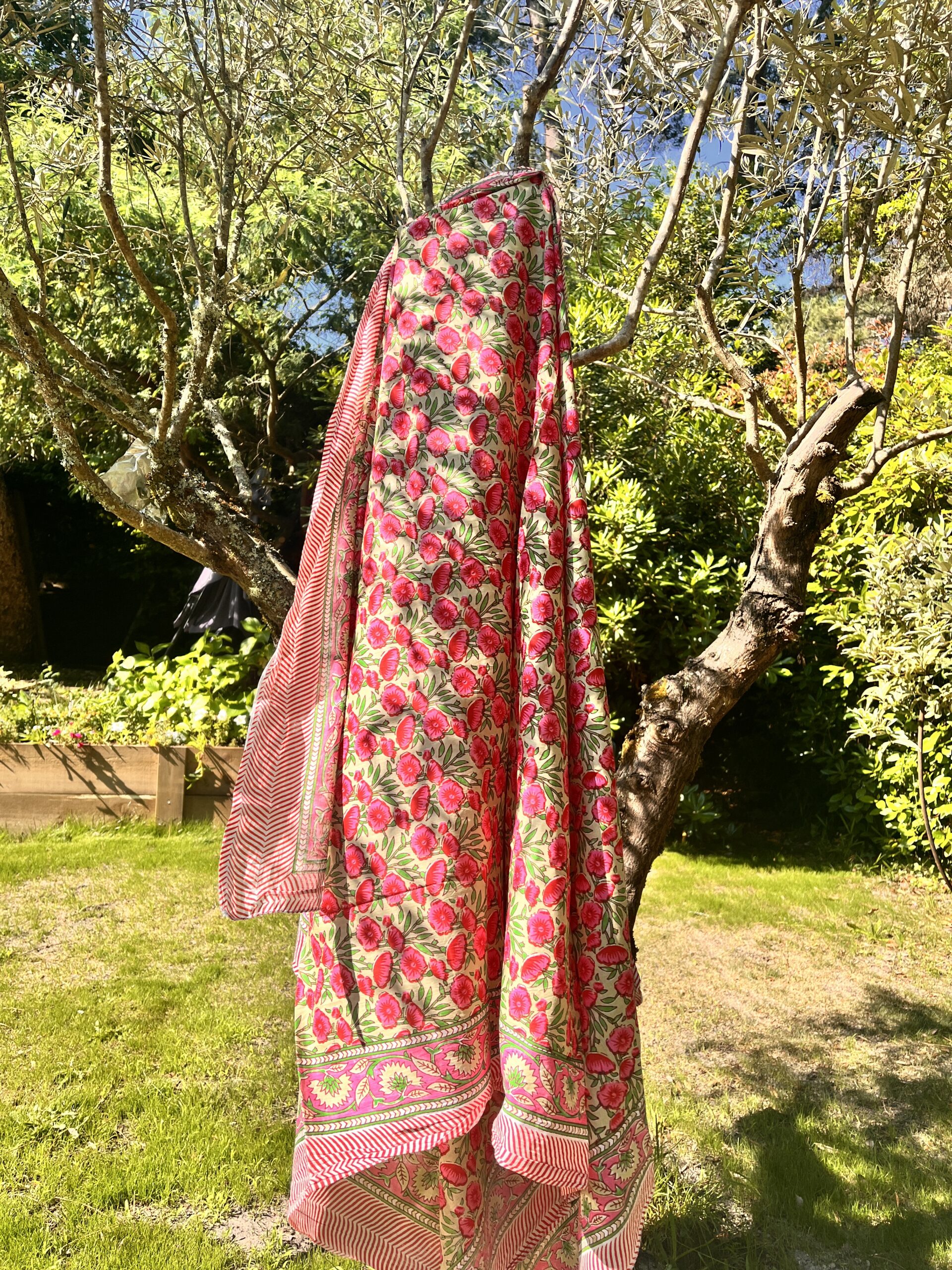 Ce paréo peut se porter l’été enroulé autour de la taille, ou comme écharpe ou étole quand il fait plus frais.