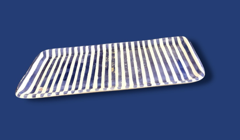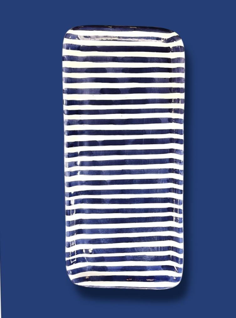 Ce joli Plat à Cake rayé Marine, est recouvert de céramique, on aime ses dessins peints à la main.