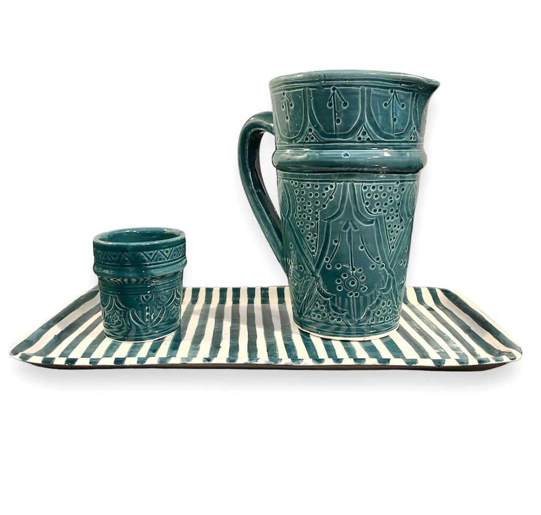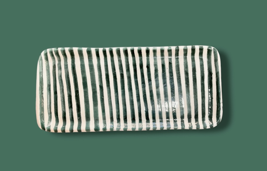 On adore le Plat à Cake rayé Vert canard en terre cuite, fabrication entièrement artisanale à Safi.