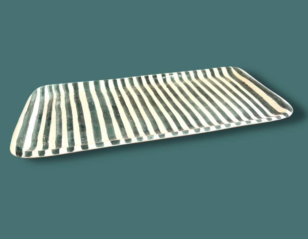 On aime le contraste chic des rayures peintes à la main au look naturel et actuel de ce Plat à Cake rayé Vert canard
