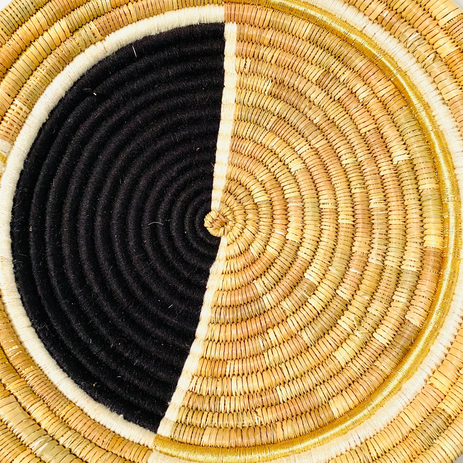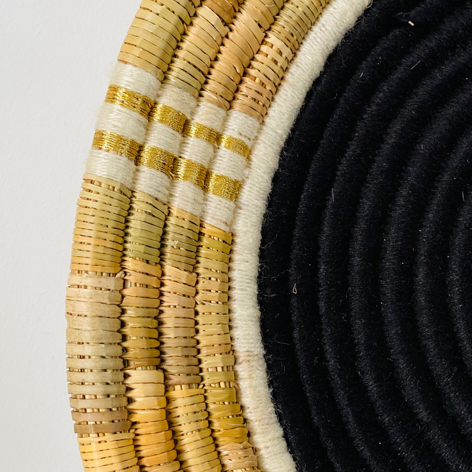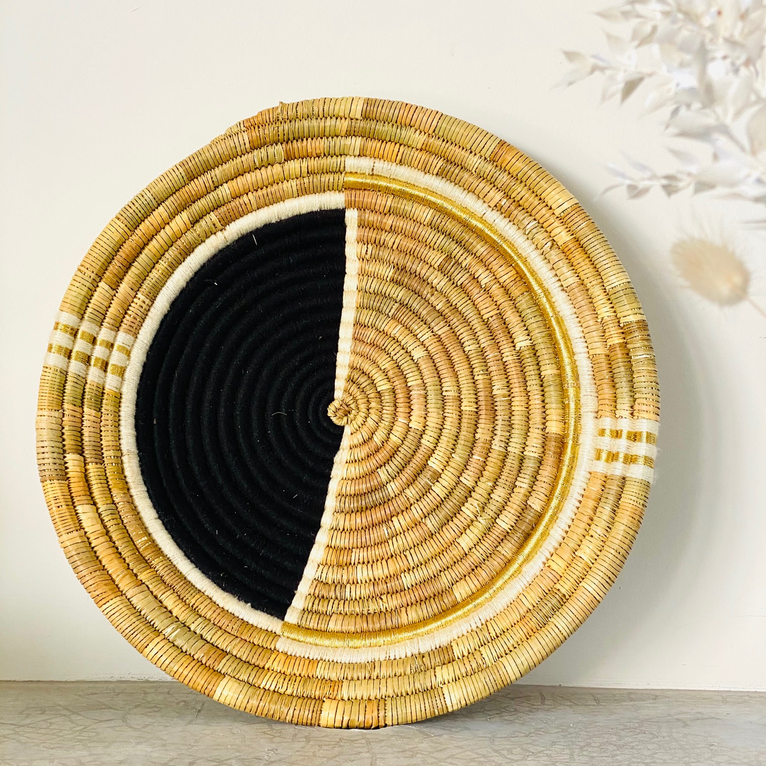 Grand plateau marocain au design épuré et graphique en fibre Smar et laine blanche et noire et son fil doré.