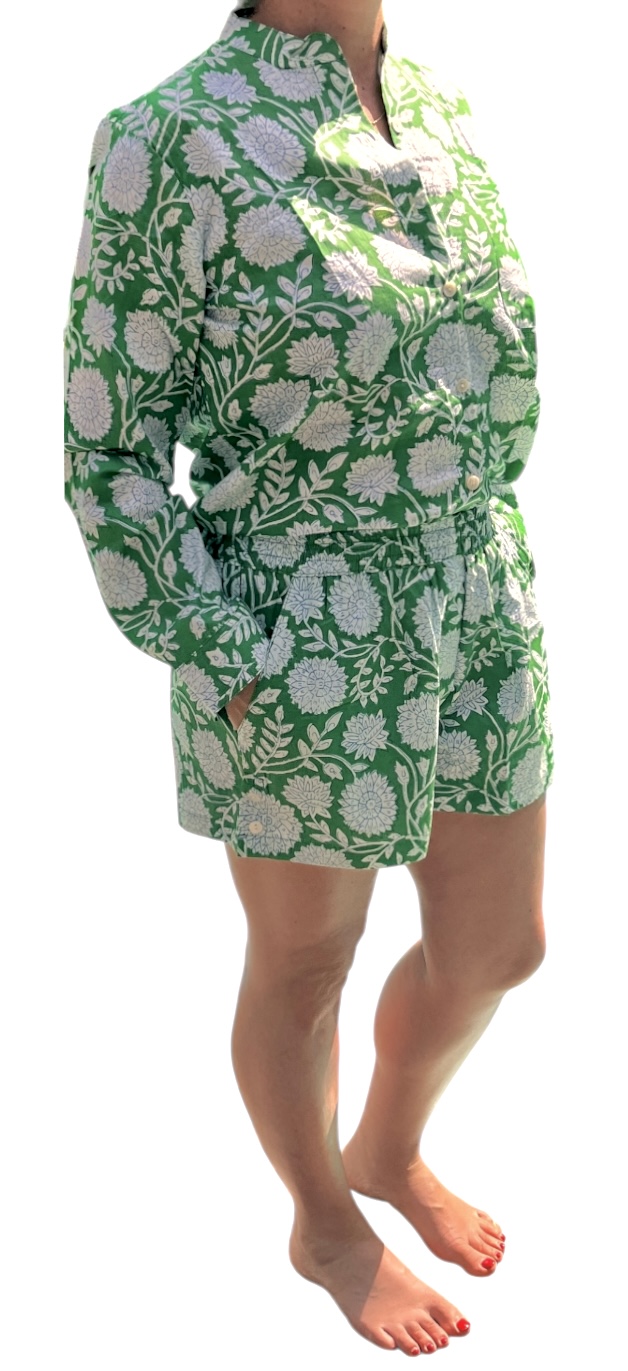Le short est confectionné un coton doux, léger et respirant, parfait pour les journées ensoleillées. Son imprimé floral est réalisé selon la technique traditionnelle du block print, une méthode artisanale indienne qui consiste à tamponner les motifs à la main à l’aide de blocs de bois sculptés.