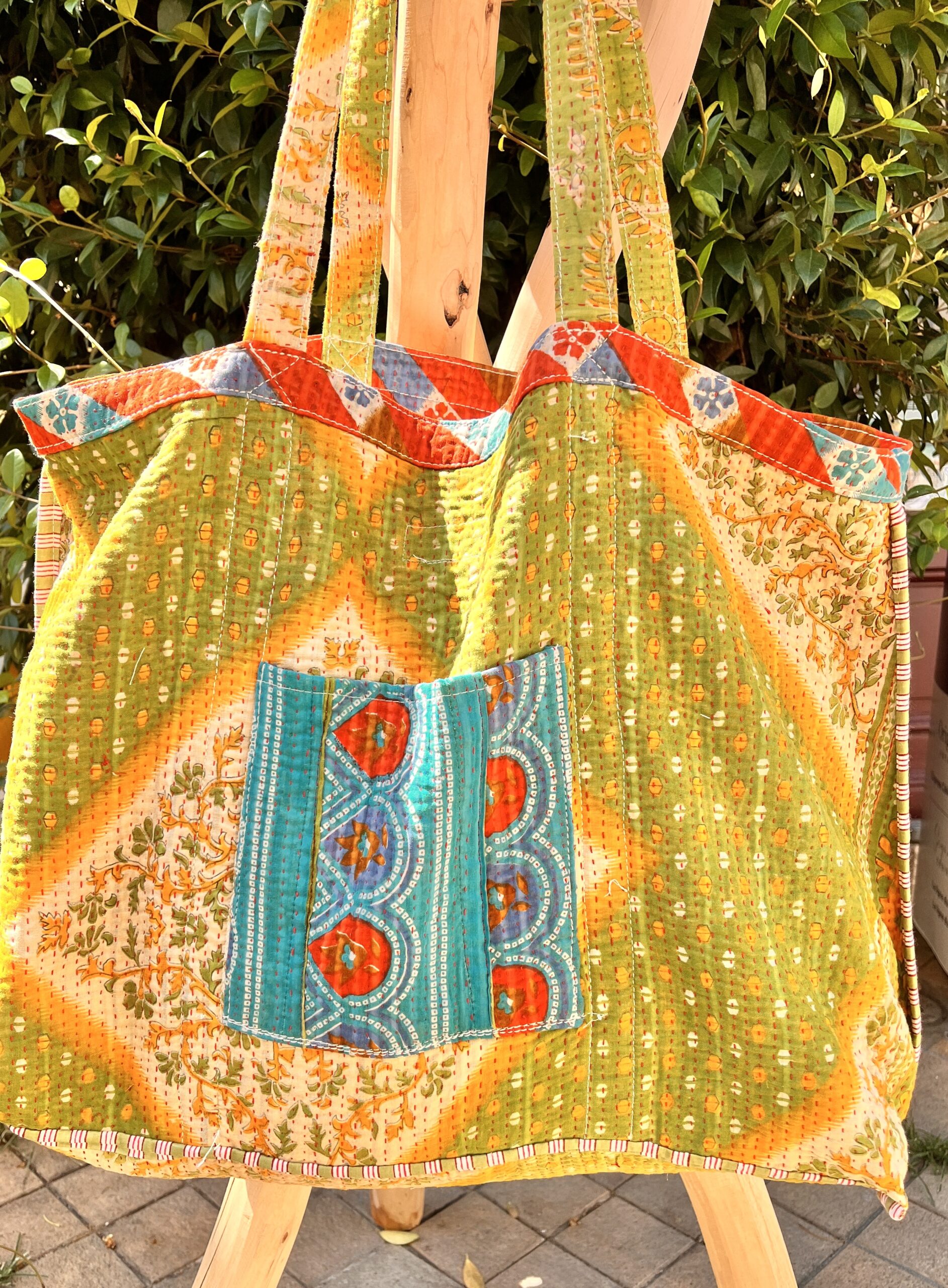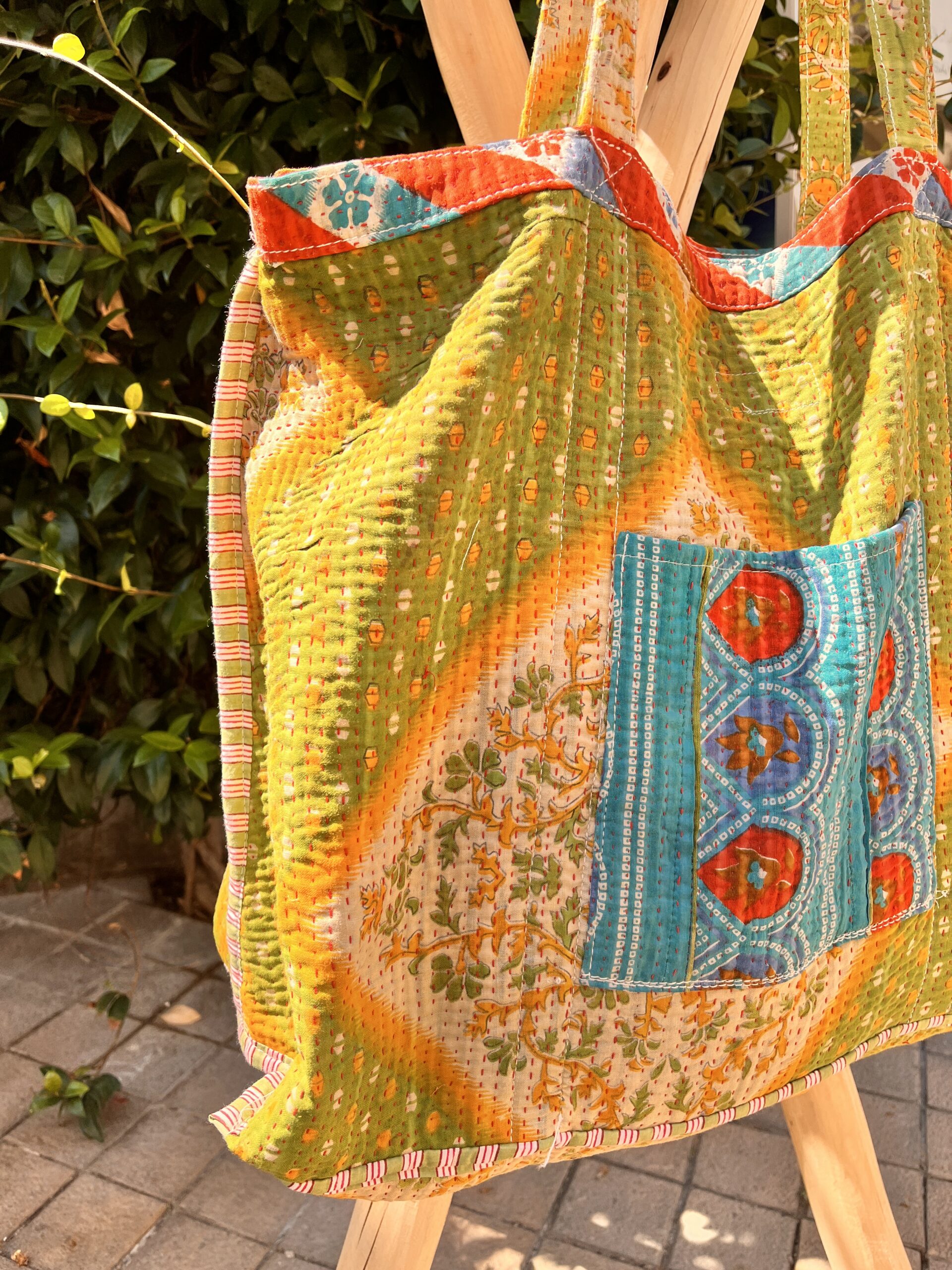 Tote bag kantha réversible en coton recyclé, fait main à partir de saris indiens. Grand format, poches pratiques, pièce unique et éthique.