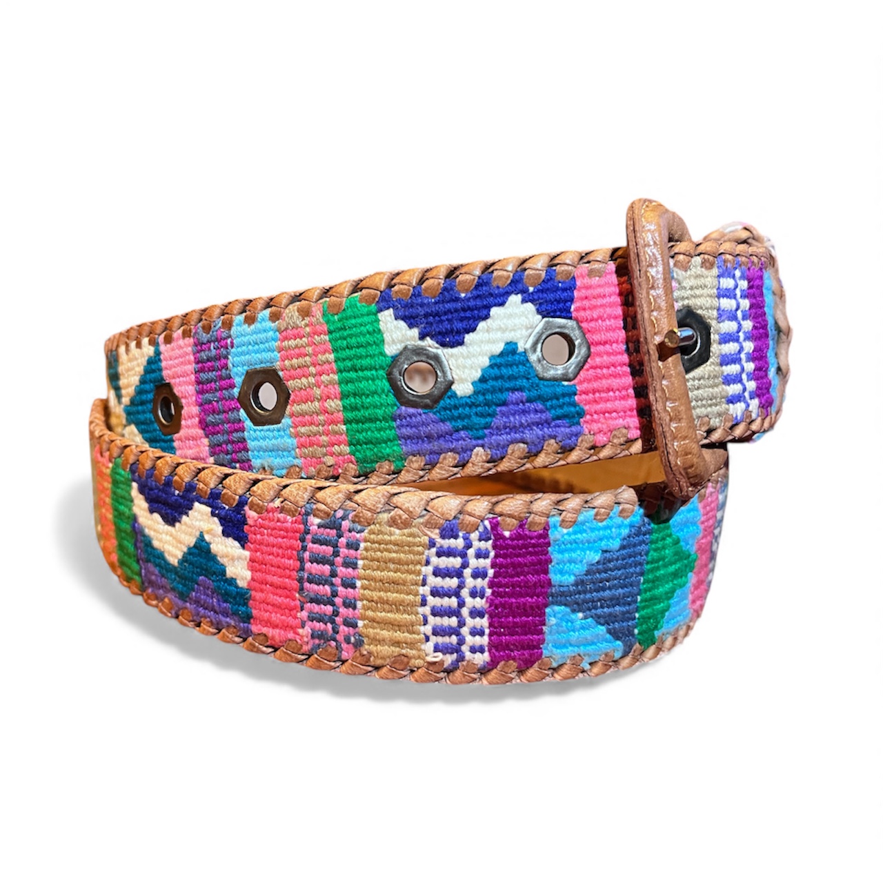Chaque ceinture est tissée selon des techniques traditionnelles, sur des métiers à bras encore utilisés aujourd’hui dans certaines régions du Guatemala. Les motifs ne suivent aucune production industrielle : ils naissent du geste précis, de la maîtrise du fil, et d’une vraie sensibilité artistique. Une fois le tissage terminé, il est assemblé sur une base en cuir véritable, choisie pour sa tenue, sa souplesse et sa longévité.