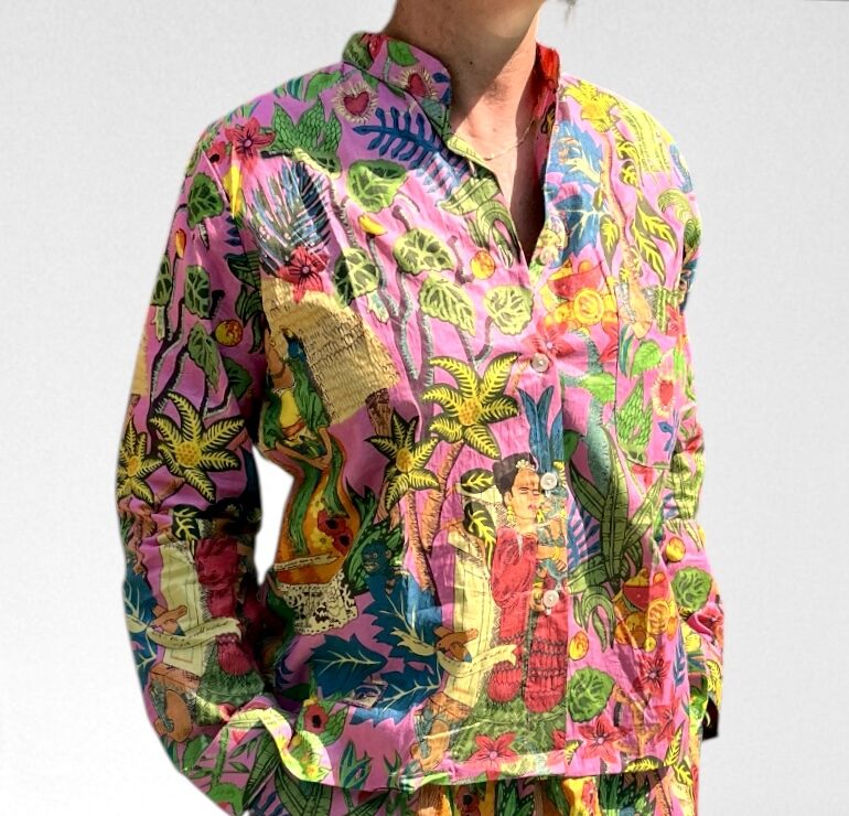 La chemise est confectionnée dans un coton doux, léger et respirant, parfait pour les journées ensoleillées. Son imprimé floral est réalisé selon la technique traditionnelle du block print, une méthode artisanale indienne qui consiste à tamponner les motifs à la main à l’aide de blocs de bois sculptés.