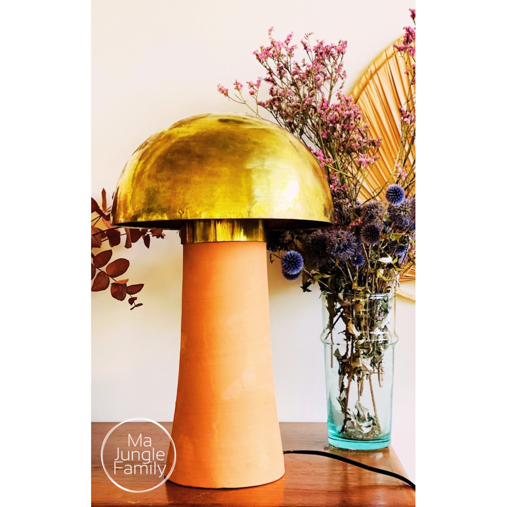 Son pied unique en terre cuite rouge de Marrakech et son abat-jour en laiton en forme de demi-sphère apporte du design dans votre univers.