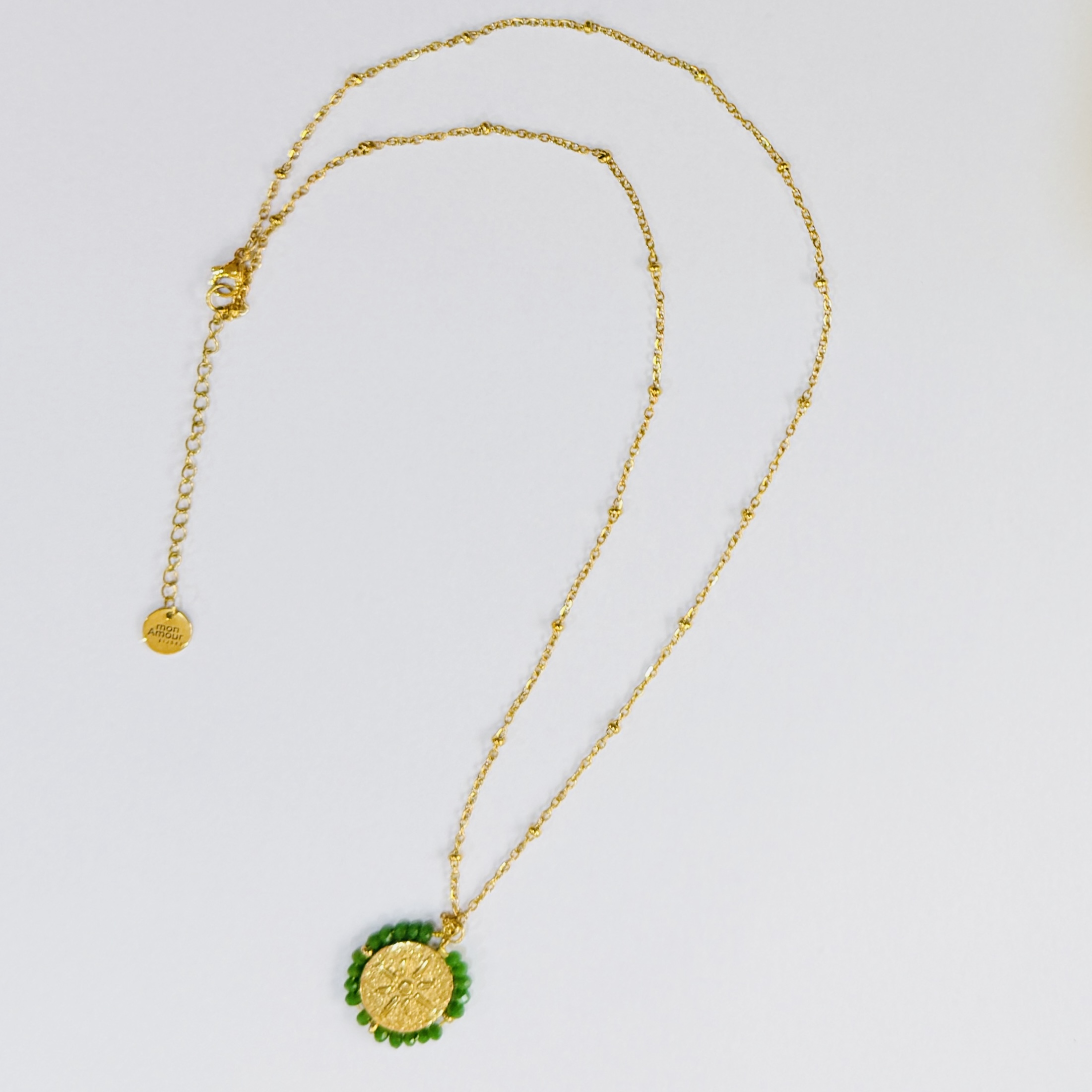 Sa chaîne fine est sublimée par de petites perles dorées qui captent la lumière à chaque mouvement. Un détail subtil qui fait toute la différence et apporte une touche solaire et élégante à votre tenue, du matin au soir.