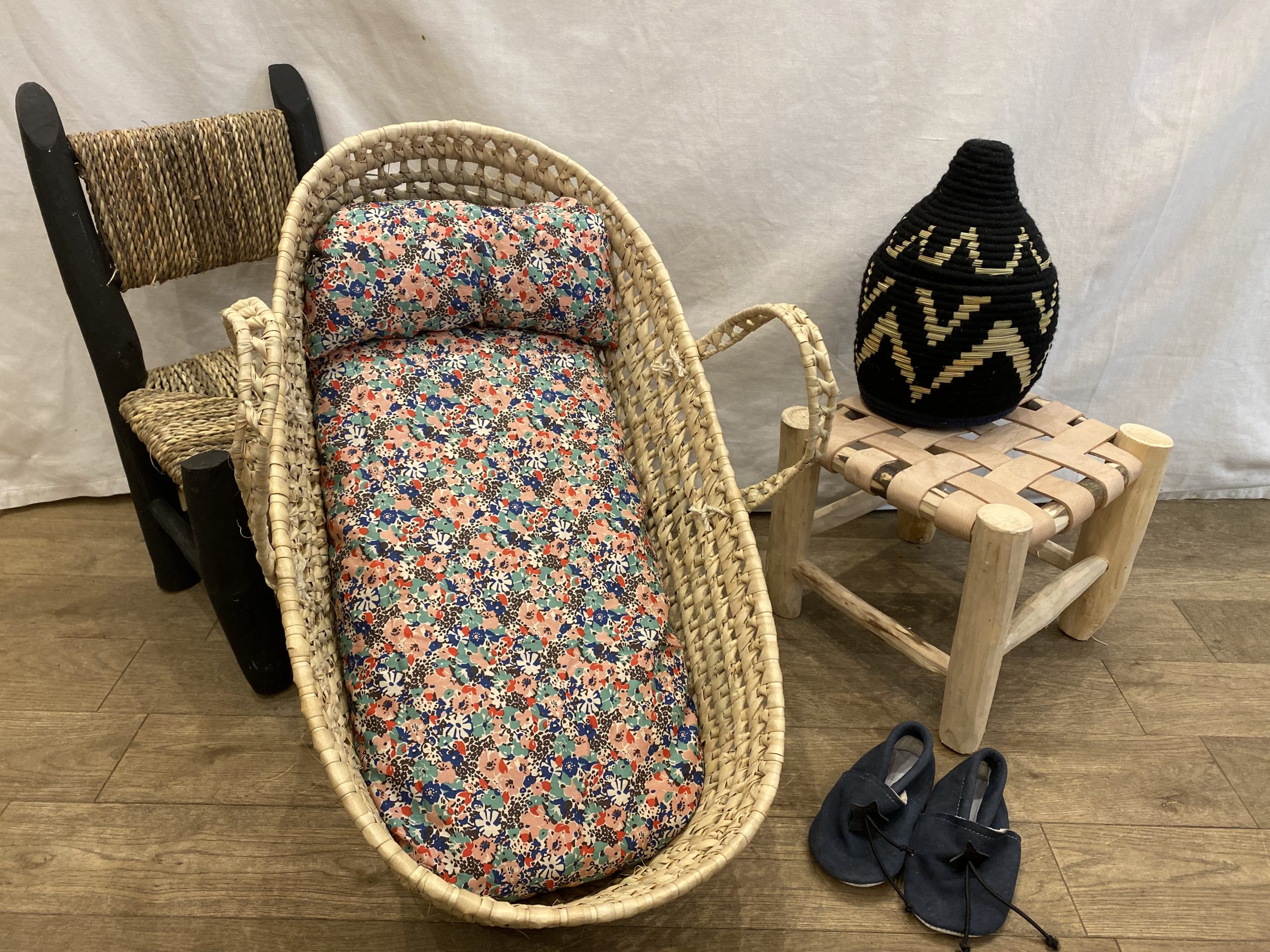 La mini chaise traditionnelle marocaine Beldi en bois de laurier et feuilles de palmier naturelles tressées.