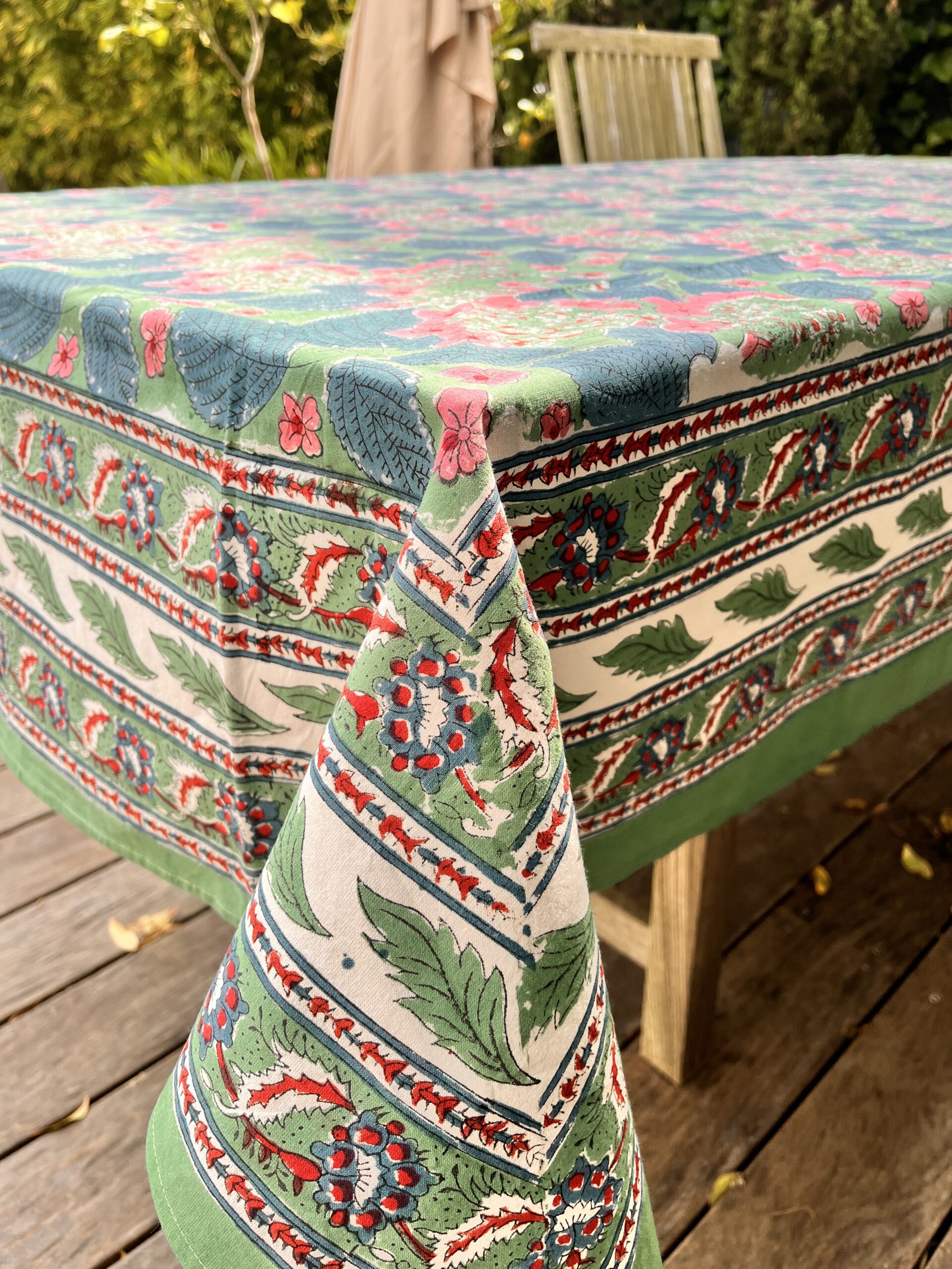 La technique du blockprint, utilisée pour créer cette nappe, fait de chaque pièce un véritable chef-d’œuvre :