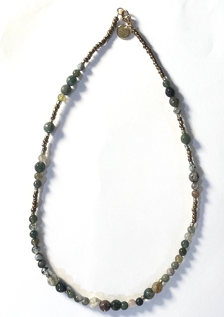 Le Collier Agathe en véritables perles agathe mousse, éclatantes avec leurs multiples nuances et mélangées de façon aléatoires avec des hématites qui apportent des bienfaits sur l’équilibre du vos énergies.