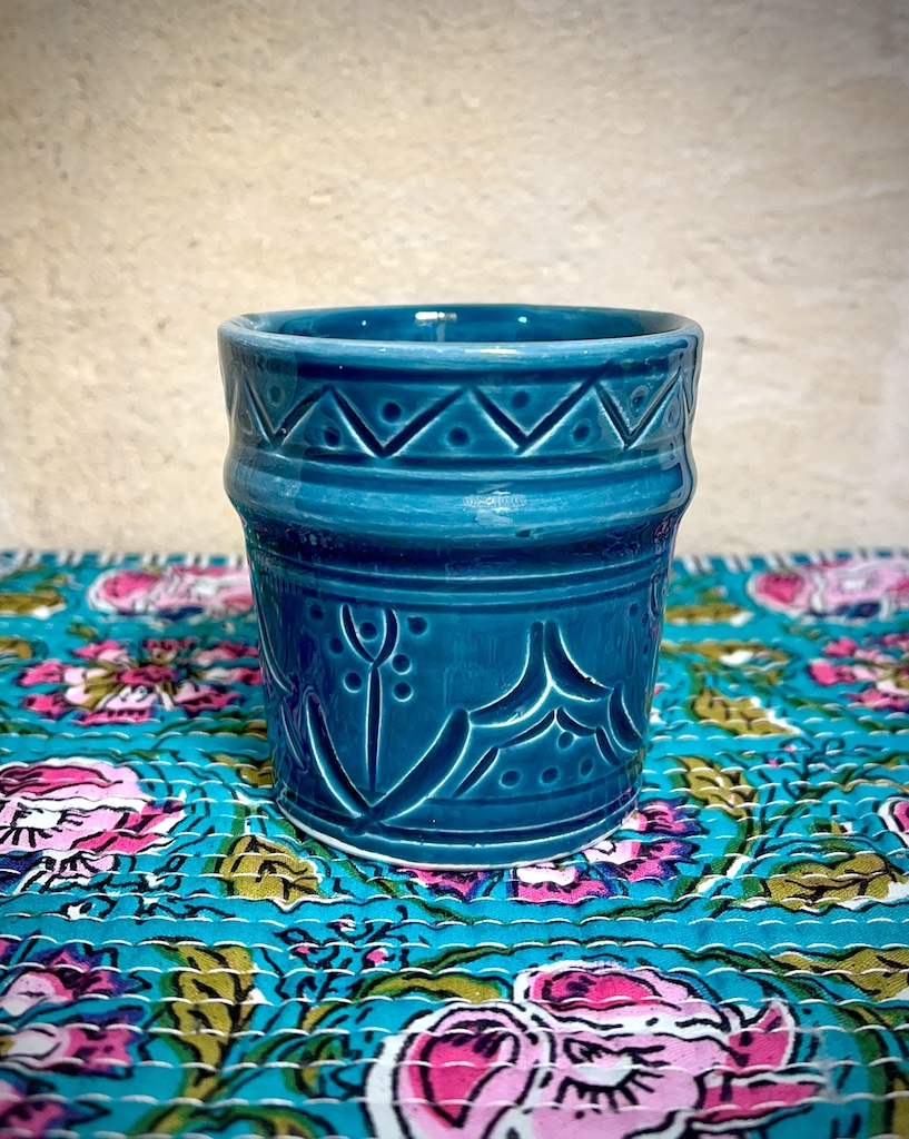 Tasse Beldi expresso Bleu Canard en terre cuite, fabrication entièrement artisanale à Safi