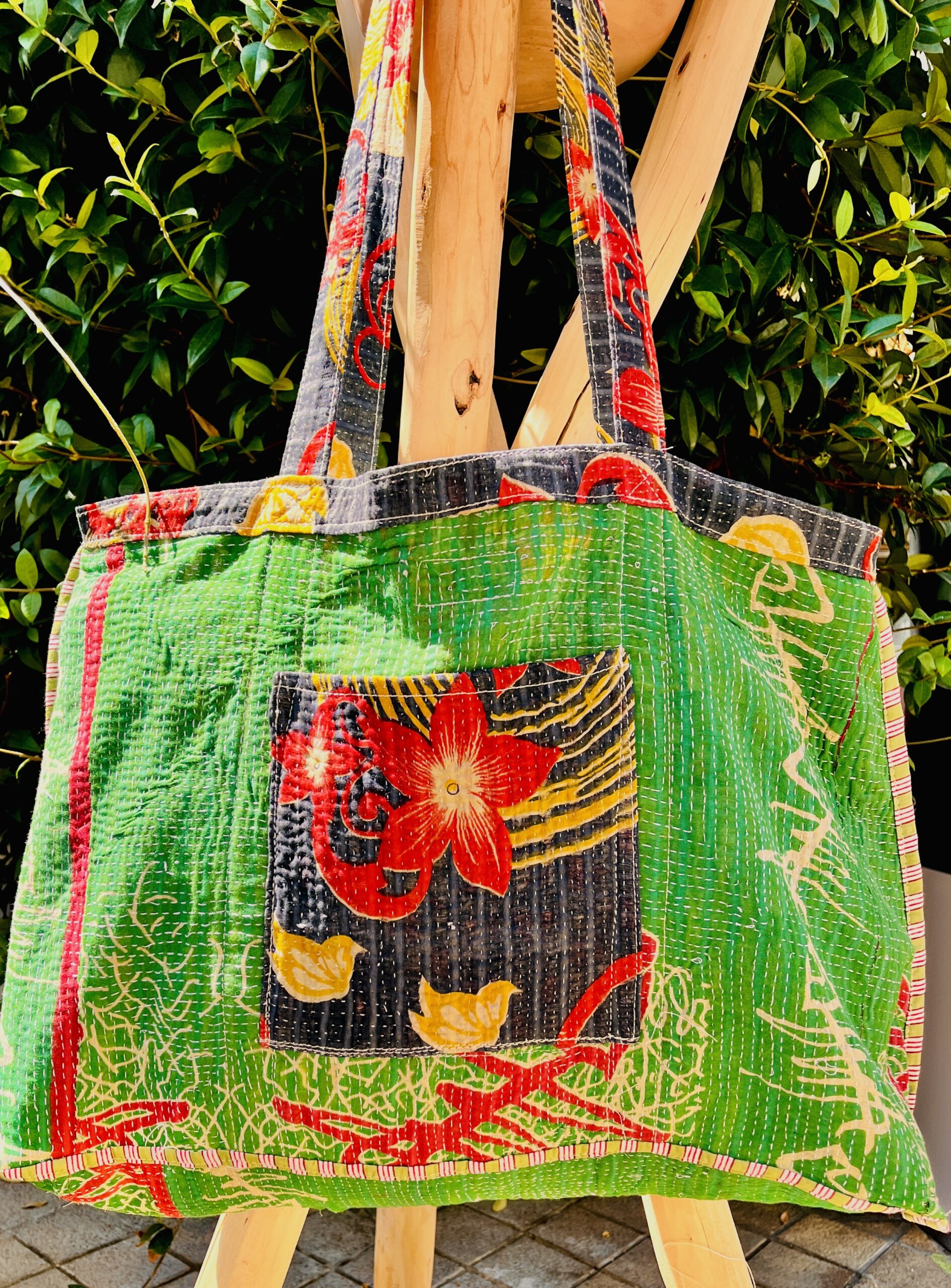 Tote bag kantha réversible en coton recyclé, fait main à partir de saris indiens. Grand format, poches pratiques, pièce unique et éthique.
